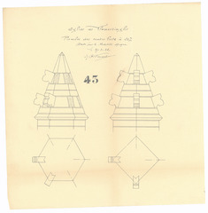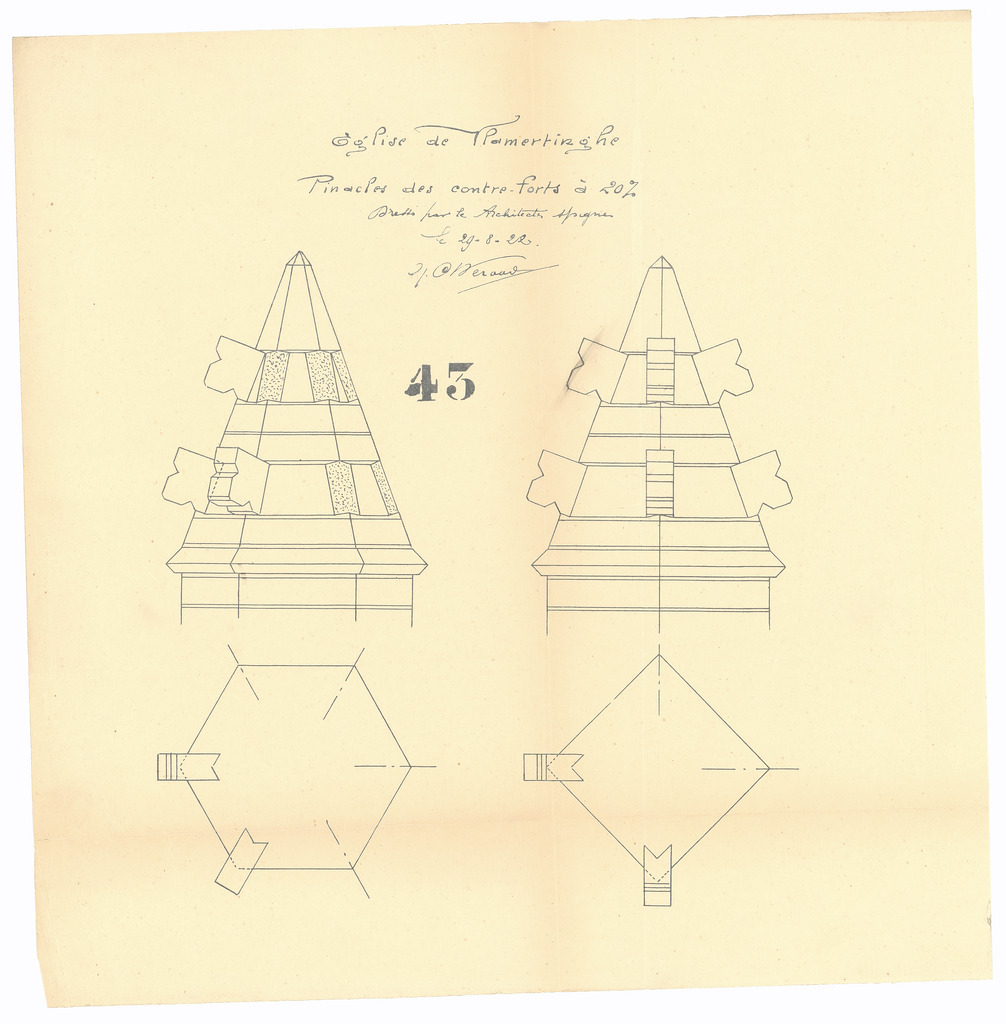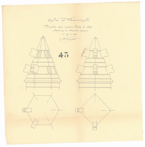 Opschrift: Eglise de Vlamertinghe. Pinacles des contre-forts Omschrijving plan: pinakels Datum KCML: deze informatie wordt niet vermeld op het archiefstuk Archiefnummer: W0737