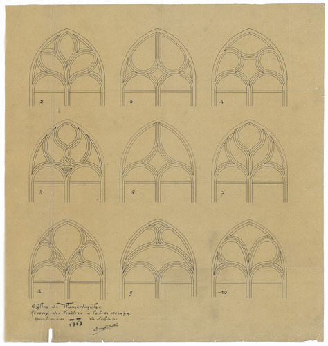 Opschrift: Eglise de Vlamertinghe. Réseaux des fenêtres. Omschrijving plan: ontwerp indeling ramen Datum KCML: deze informatie wordt niet vermeld op het archiefstuk Archiefnummer: W0749