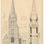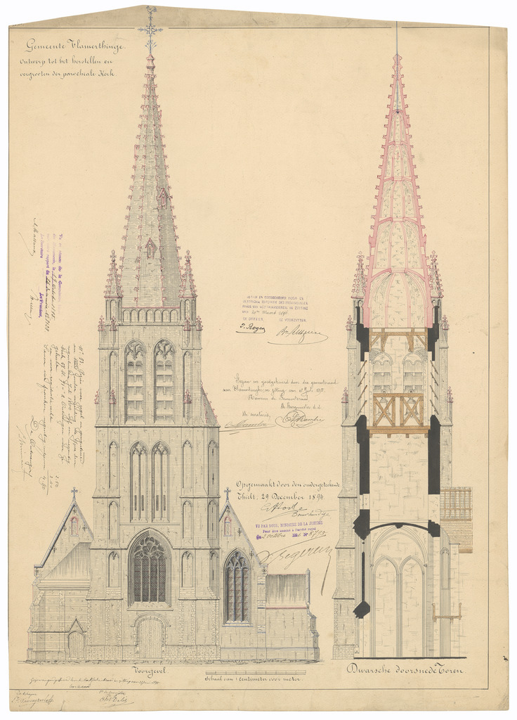 Opschrift: Gemeente Vlamerthinge. Ontwerp tot het herstellen en vergrooten der parochiale kerk. Omschrijving plan: opstand voorgevel en dwarsdoorsnede Datum KCML: 19/10/1895 Archiefnummer: W0720