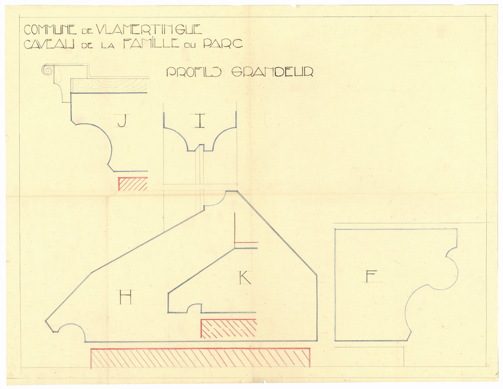 Opschrift: Commune de Vlamertinghe. Caveau de la Famille du Parc. Omschrijving plan: ontwerp grafkelder, detailtekeningen profielen Datum KCML: deze informatie wordt niet vermeld op het archiefstuk Archiefnummer: W0781