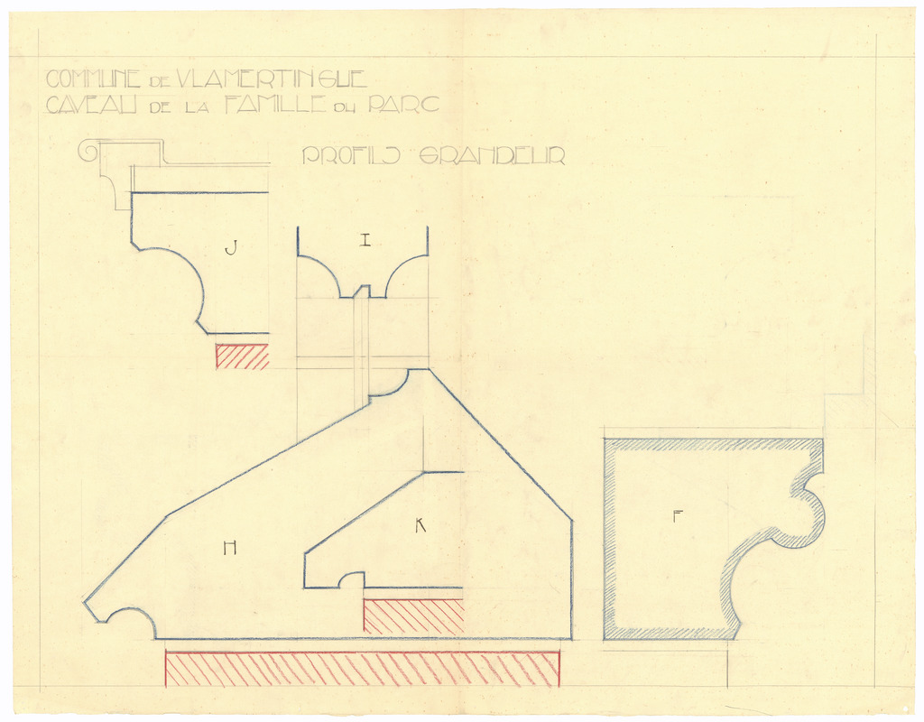 Opschrift: Commune de Vlamertinghe. Caveau de la Famille du Parc. Omschrijving plan: ontwerp grafkelder, detailtekeningen profielen Datum KCML: deze informatie wordt niet vermeld op het archiefstuk Archiefnummer: W0782