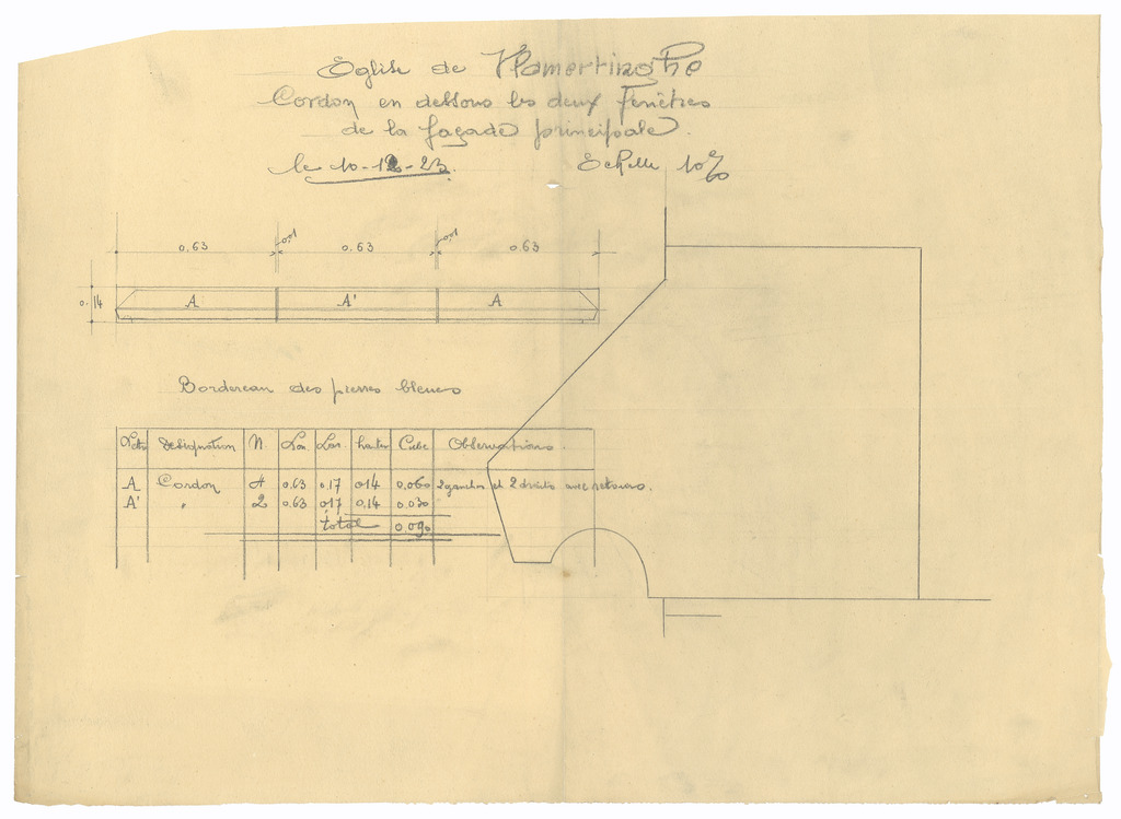 Opschrift: Eglise de Vlamertinghe. Cordon en dessous les deux deux fenêtres de la façade principale. Omschrijving plan: ontwerp vensterbanken Datum KCML: deze informatie wordt niet vermeld op het archiefstuk Archiefnummer: W0775