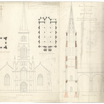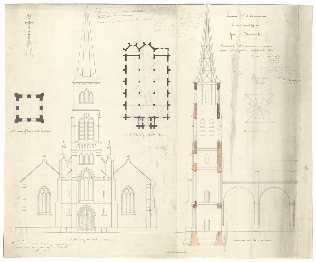 Opschrift: Arrondissement Yperen. Gemeente Dickebusch. Ontwerp tot het bouwen van eenen nieuwen toren, en het vergrooten en herstellen der kerk. Omschrijving plan: plattegrond, opstand voorgevel, langsdoorsnede Datum KCML: 14/12/1872 Archiefnummer: W0713