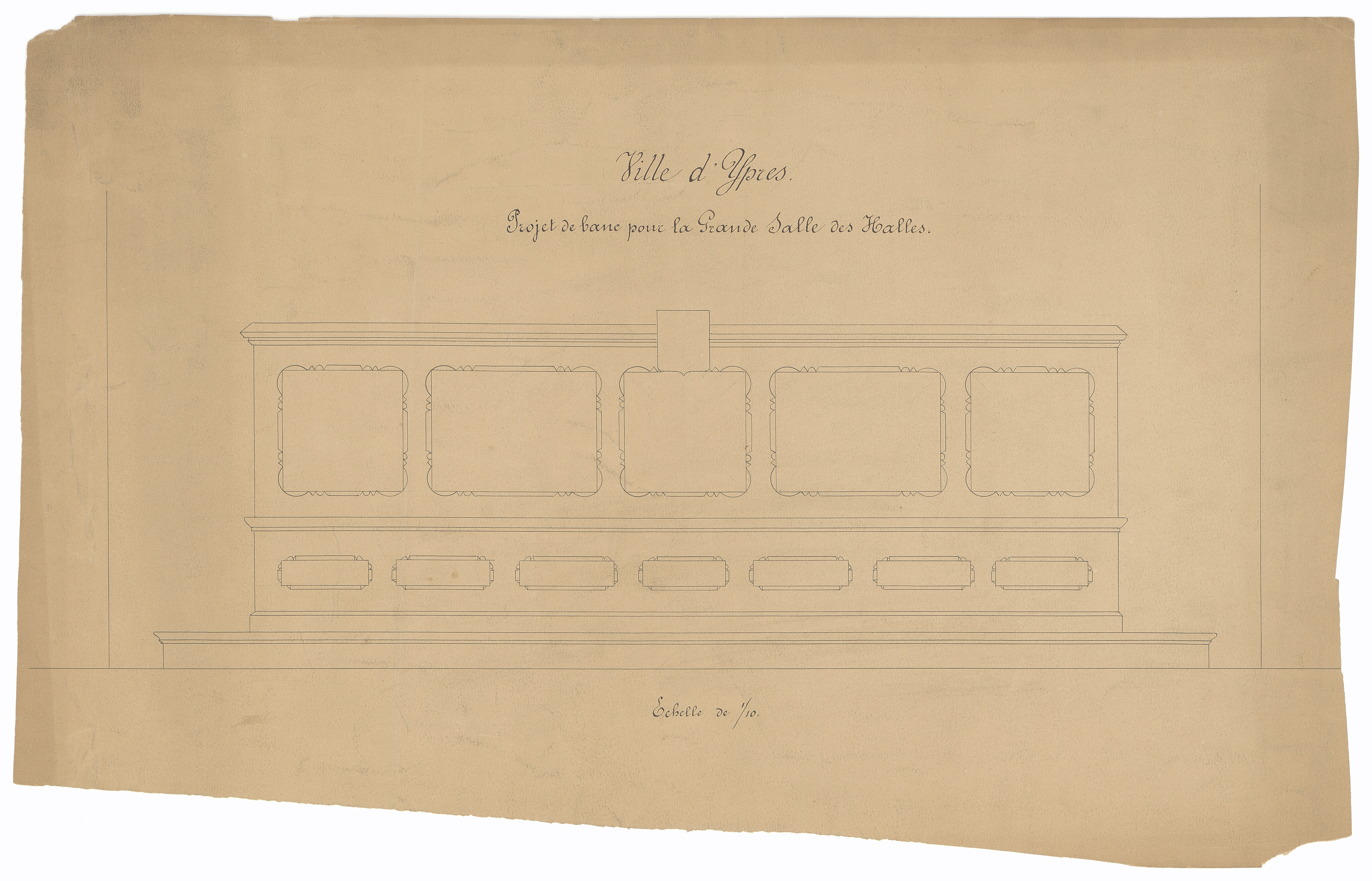 Opschrift: Ville d'Ypres. Projet de banc pour la Grande Salle des Halles Omschrijving plan: ontwerp zitbank Datum KCML: deze informatie wordt niet vermeld op het archiefstuk Archiefnummer: W0711