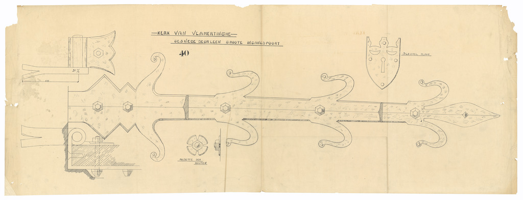 Opschrift: Kerk van Vlamertinghe. Gesnede deurleen groote ingangspoort Omschrijving plan: deurbeslag Datum KCML: deze informatie wordt niet vermeld op het archiefstuk Archiefnummer: W0767