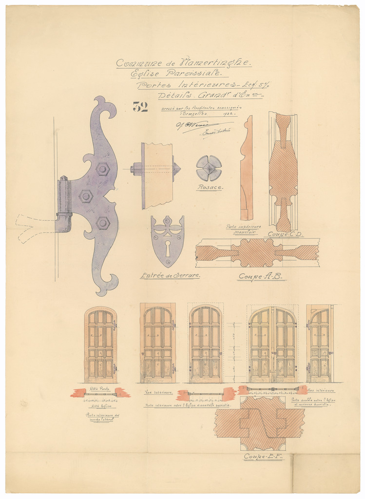 Opschrift: Commune de Vlamertinghe. Eglise Paroissiale. Portes Intérieures Omschrijving plan: binnendeuren: detailtekeningen Datum KCML: deze informatie wordt niet vermeld op het archiefstuk Archiefnummer: W0729
