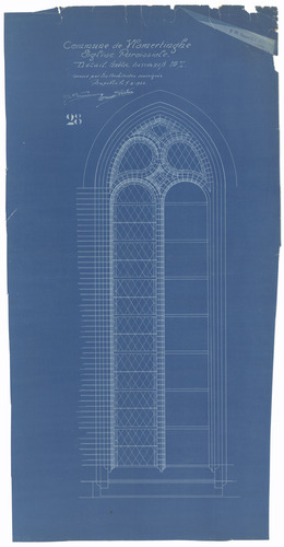 Opschrift: Commune de Vlamertinghe. Eglise paroissiale. Détail fenêtre basses nefs Omschrijving plan: detail glas-in-lood Datum KCML: deze informatie wordt niet vermeld op het archiefstuk Archiefnummer: W0741