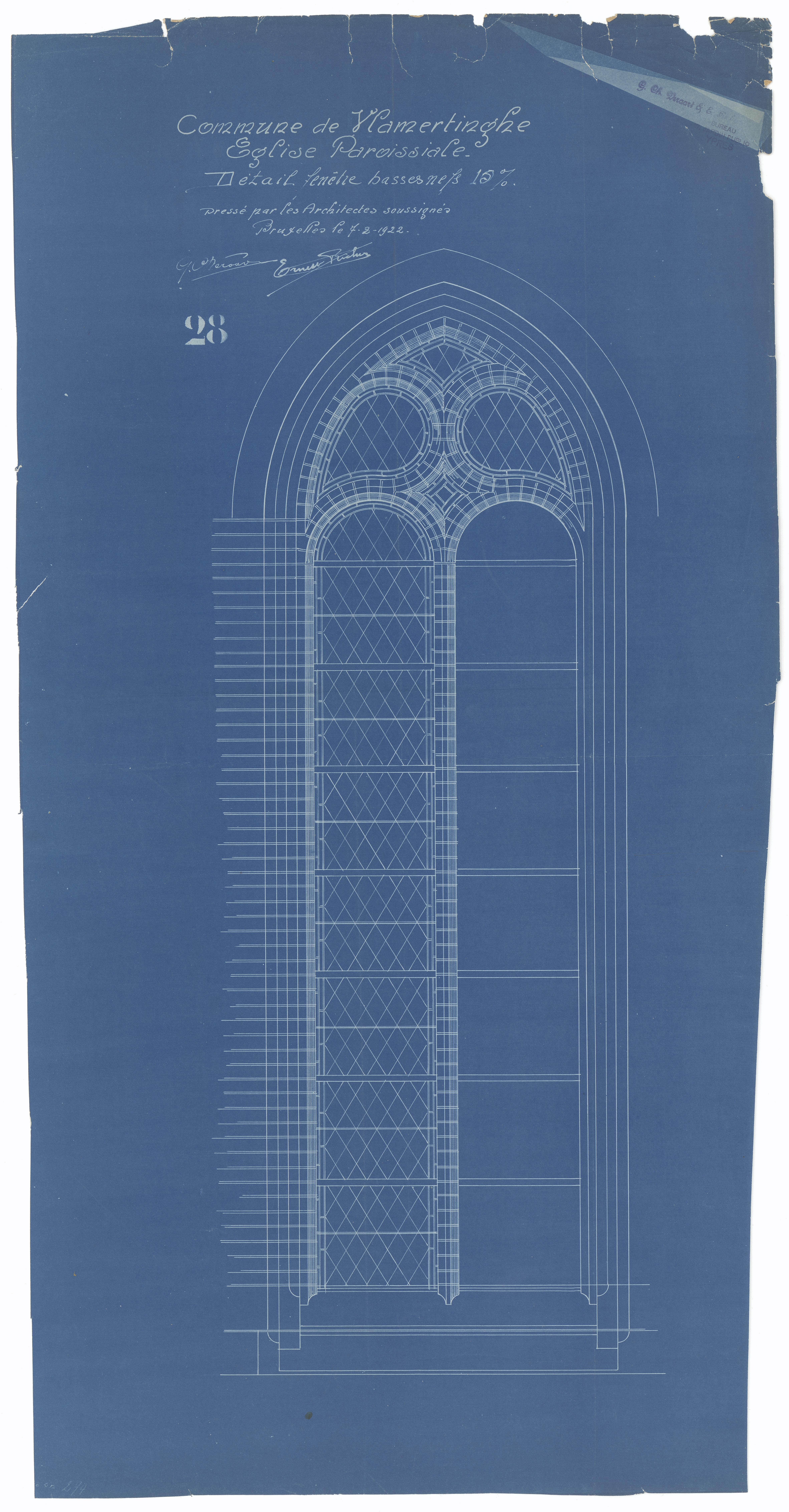 Opschrift: Commune de Vlamertinghe. Eglise paroissiale. Détail fenêtre basses nefs Omschrijving plan: detail glas-in-lood Datum KCML: deze informatie wordt niet vermeld op het archiefstuk Archiefnummer: W0741