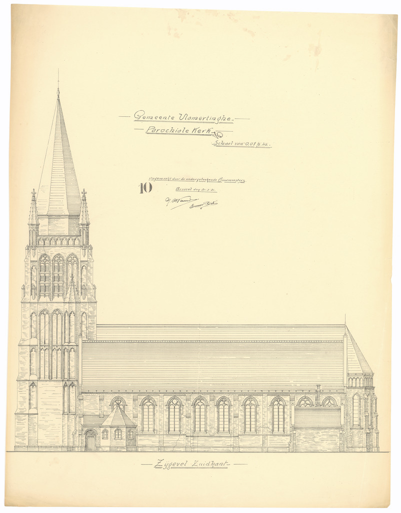 Opschrift: Gemeente Vlamertinghe. Parochiale Kerk Omschrijving plan: opstand Z-gevel Datum KCML: deze informatie wordt niet vermeld op het archiefstuk Archiefnummer: W0734