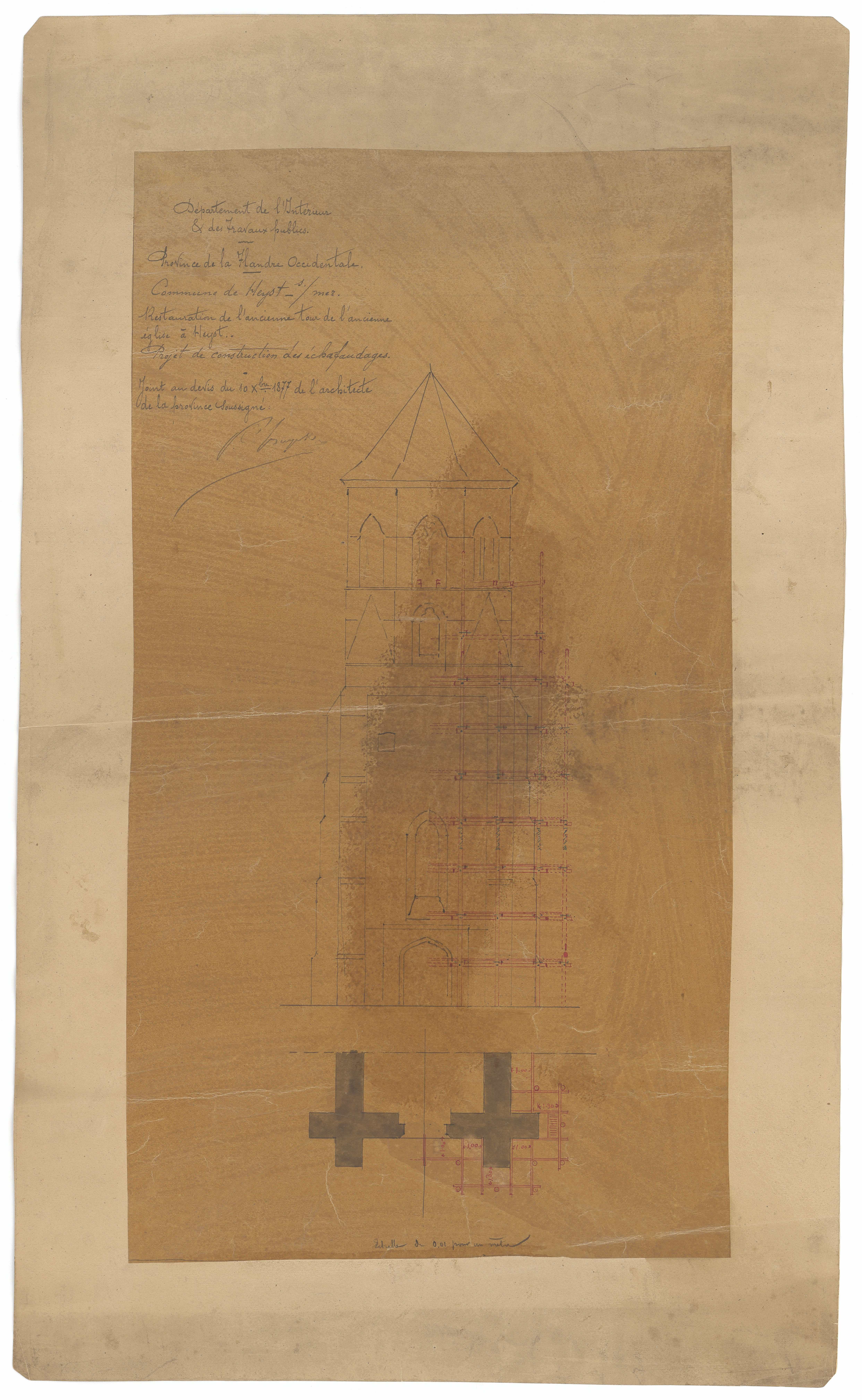 Opschrift: Département de l'Intérieur & des Travaux publics. Province de la Flandre Occidentale. Commune de Heyst s/mer. Restauration de l'ancienne tour de l'ancienne église à Heyst. Projet de construction des échafaudages. Omschrijving plan: gedeeltelijke opstand voorgevel (toren) Datum KCML: deze informatie wordt niet vermeld op het archiefstuk Archiefnummer: W0869