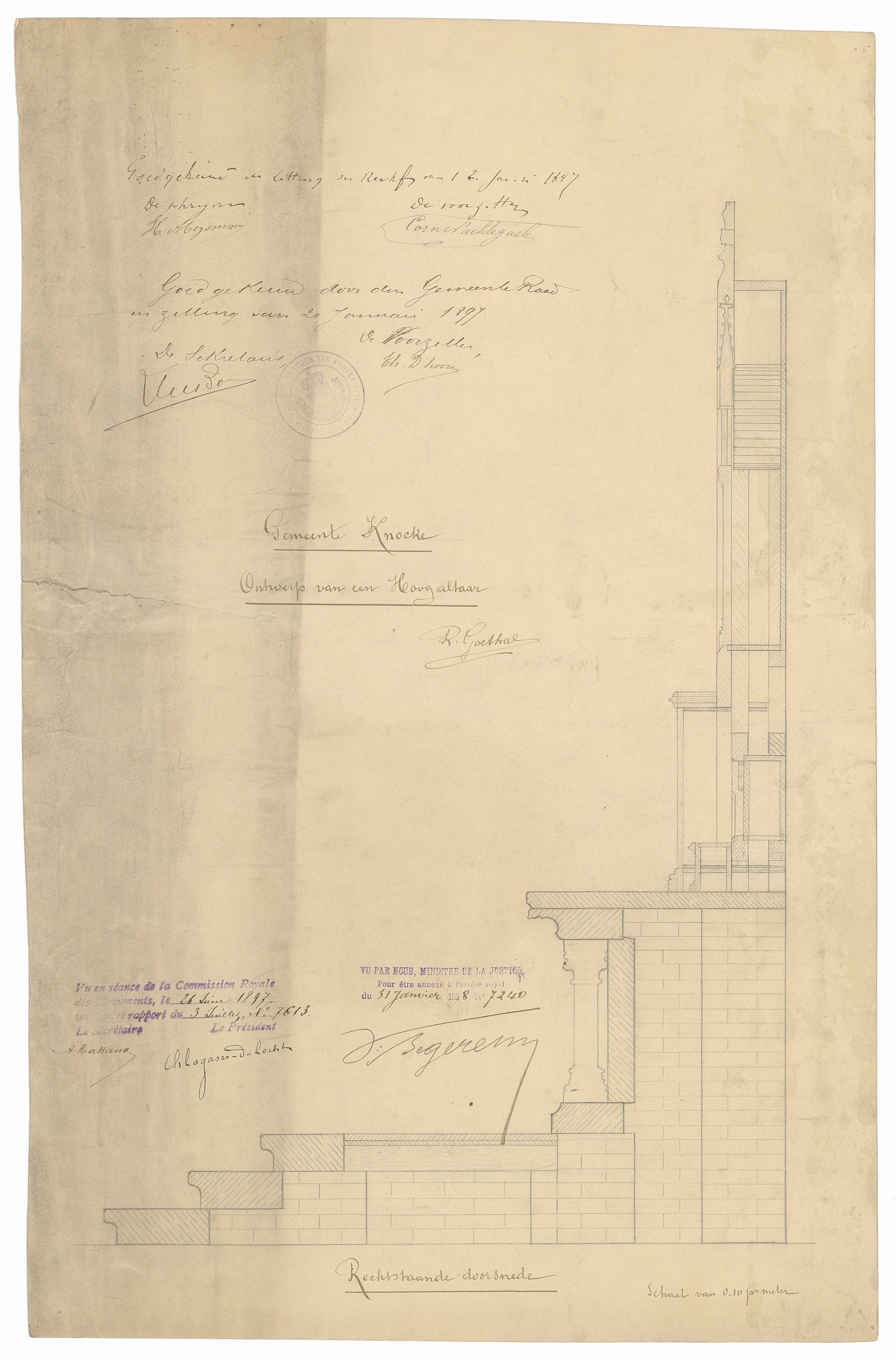 Opschrift: Gemeente Knocke. Ontwerp van een Hoogaltaar Omschrijving plan: ontwerp hoogaltaar: doorsnede Datum KCML: 26/06/1897 Archiefnummer: W0882