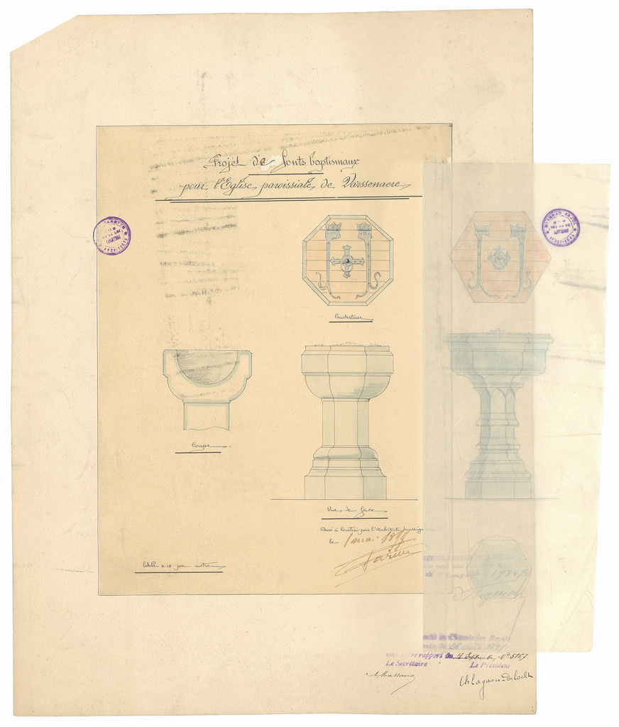 Opschrift: Projet de fonts baptismaux pour l'Eglise paroissiale de Varssenaere Omschrijving plan: ontwerp doopvont Datum KCML: 28/08/1897 Archiefnummer: W0852_02