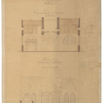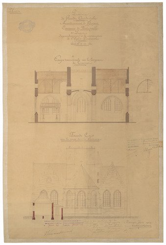 Opschrift: Province de Flandre Occidentale. Arrondissement de Bruges. Commune de Westcapelle. 2me Projet d'agrandissement et de restauration de l'Eglise Paroissiale. Omschrijving plan: opstand achtergevel en dwarsdoorsnede Datum KCML: 20/08/1904 Archiefnummer: W0897