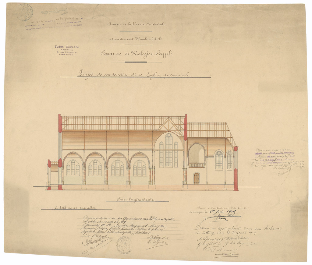 Opschrift: Province de la Flandre Occidentale. Arrondissement Roulers-Thielt. Commune de Rolleghem-Cappelle. Projet de construction d'une Eglise paroissiale. Omschrijving plan: langsdoorsnede Datum KCML: deze informatie wordt niet vermeld op het archiefstuk Archiefnummer: W1108