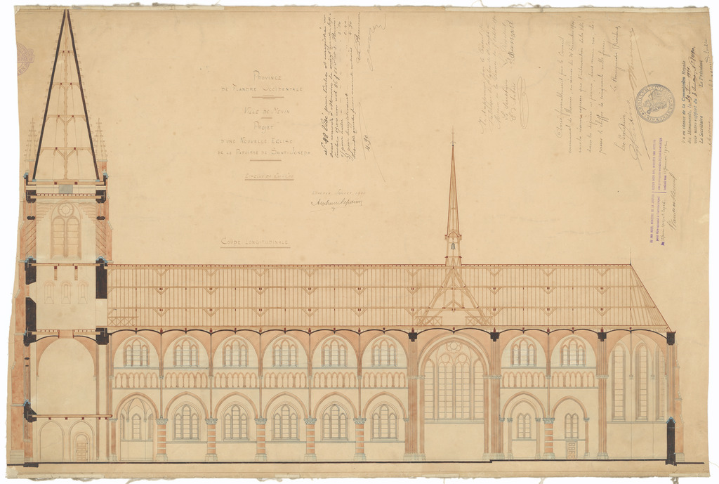 Opschrift: Province de Flandre Occidentale. Ville de Menin. Projet d'une nouvelle Eglise de la Paroisse de Saint-Joseph Omschrijving plan: langsdoorsnede Datum KCML: 29/06/1901 Archiefnummer: W1165