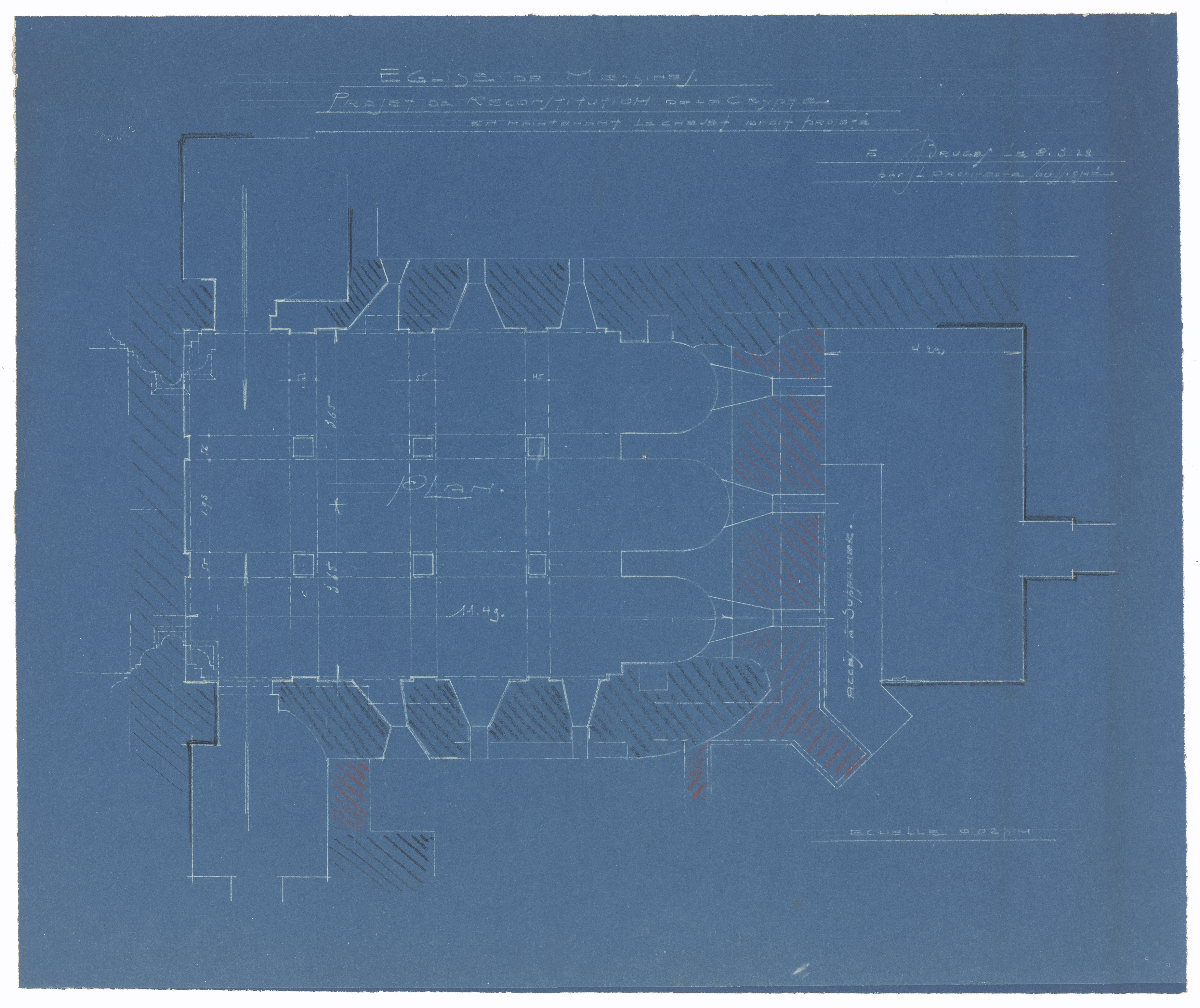 Opschrift: Eglise de Messines. Projet de reconstruction de la crypte en maintenant le chevet droit projeté Omschrijving plan: plattegrond niveau 0 Datum KCML: deze informatie wordt niet vermeld op het archiefstuk Archiefnummer: W1199