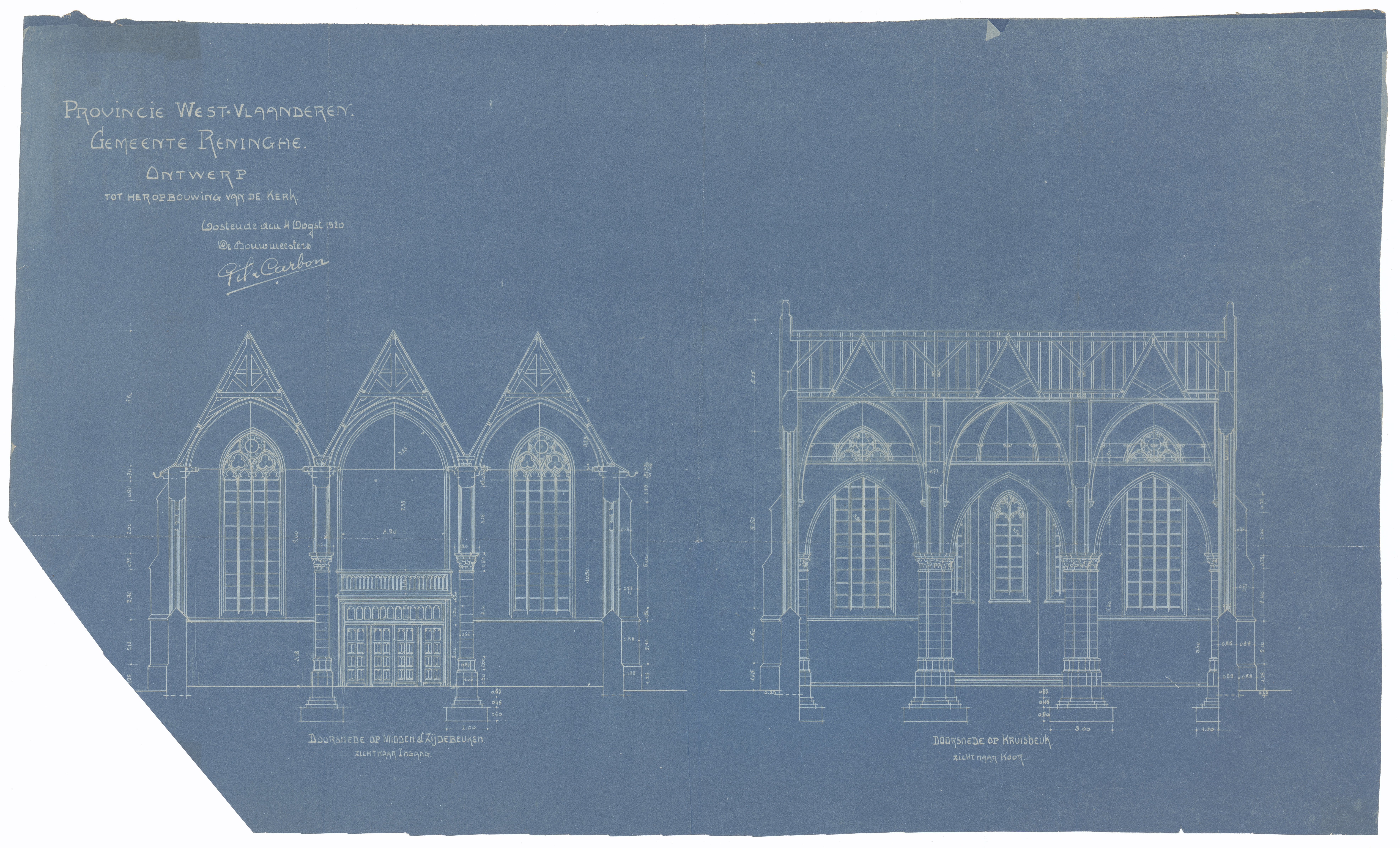 Opschrift: Provincie West-Vlaanderen. Geeente Reninghe. Ontwerp tot heropbouwing van de kerk. Omschrijving plan: dwarsdoorsnede Datum KCML: deze informatie wordt niet vermeld op het archiefstuk Archiefnummer: W1149