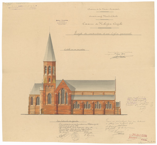 Opschrift: Province de la Flandre Occidentale. Arrondissement Roulers-Thielt. Commune de Rolleghem-Cappelle. Projet de construction d'une Eglise paroissiale. Omschrijving plan: opstand zijgevel 1 Datum KCML: 9-4-1910 Archiefnummer: W1106