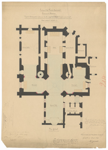 Opschrift: Province de la Flandre Occidentale. Commune de Messines. Projet de Restauration intérieure du Transept et de la Nef de l'Eglise paroissiale Omschrijving plan: plattegrond niveau 0 Datum KCML: 27/04/1889 Archiefnummer: W1185