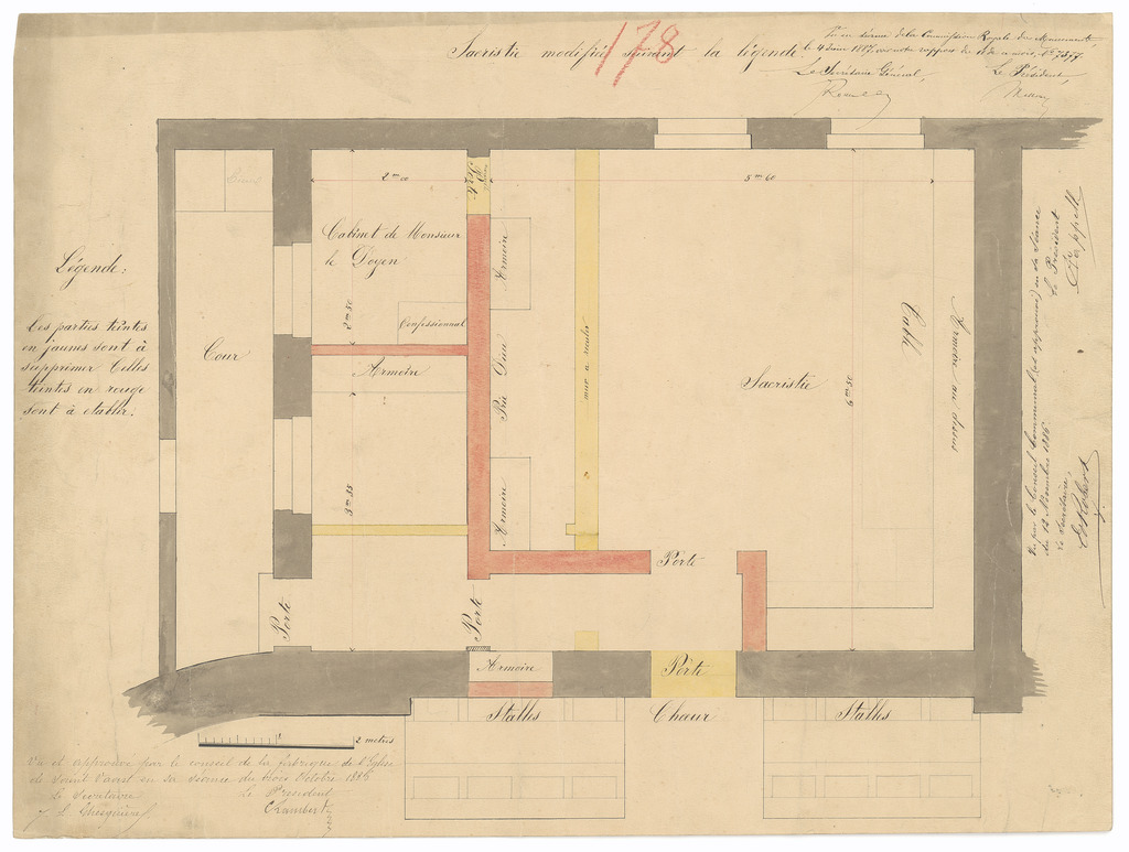 Opschrift: Sacristie modifiée suivant la légende. Omschrijving plan: plattegrond niveau 0 Datum KCML: 04/06/1887 Archiefnummer: W1154