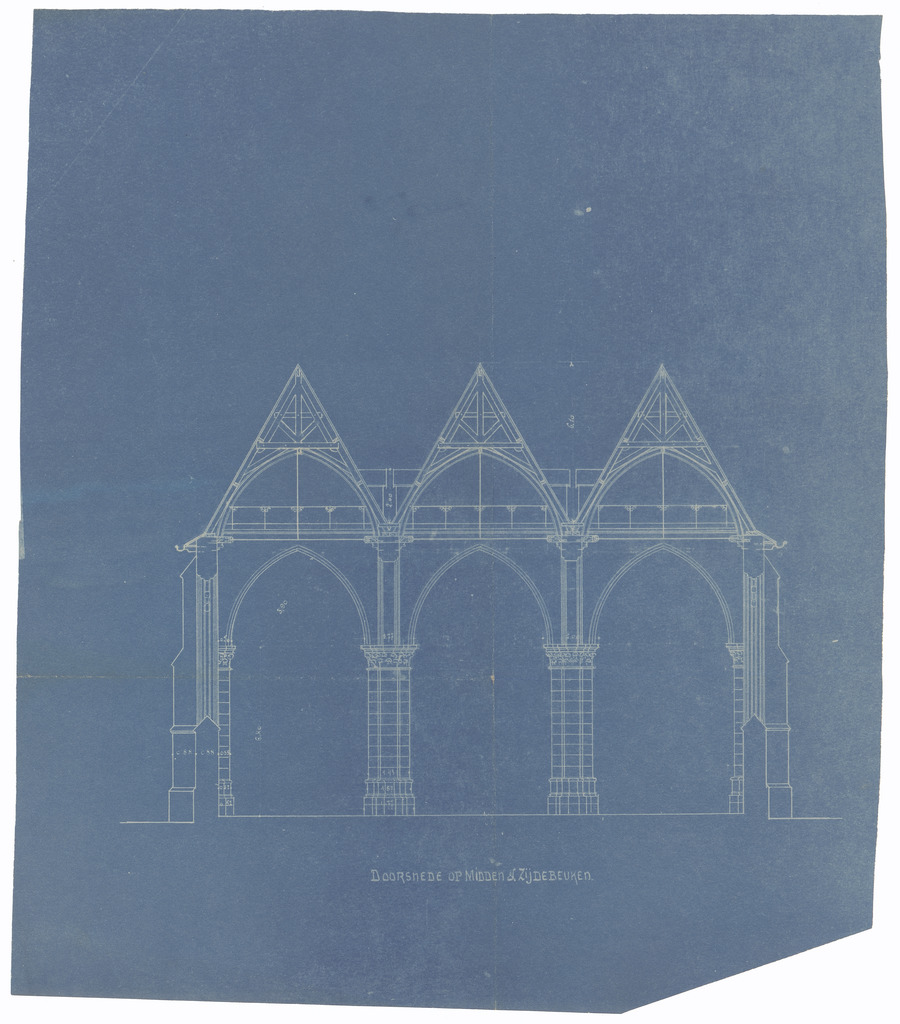 Opschrift: Doorsnede op midden & zijbeuken Omschrijving plan: dwarsdoorsnede Datum KCML: deze informatie wordt niet vermeld op het archiefstuk Archiefnummer: W1148