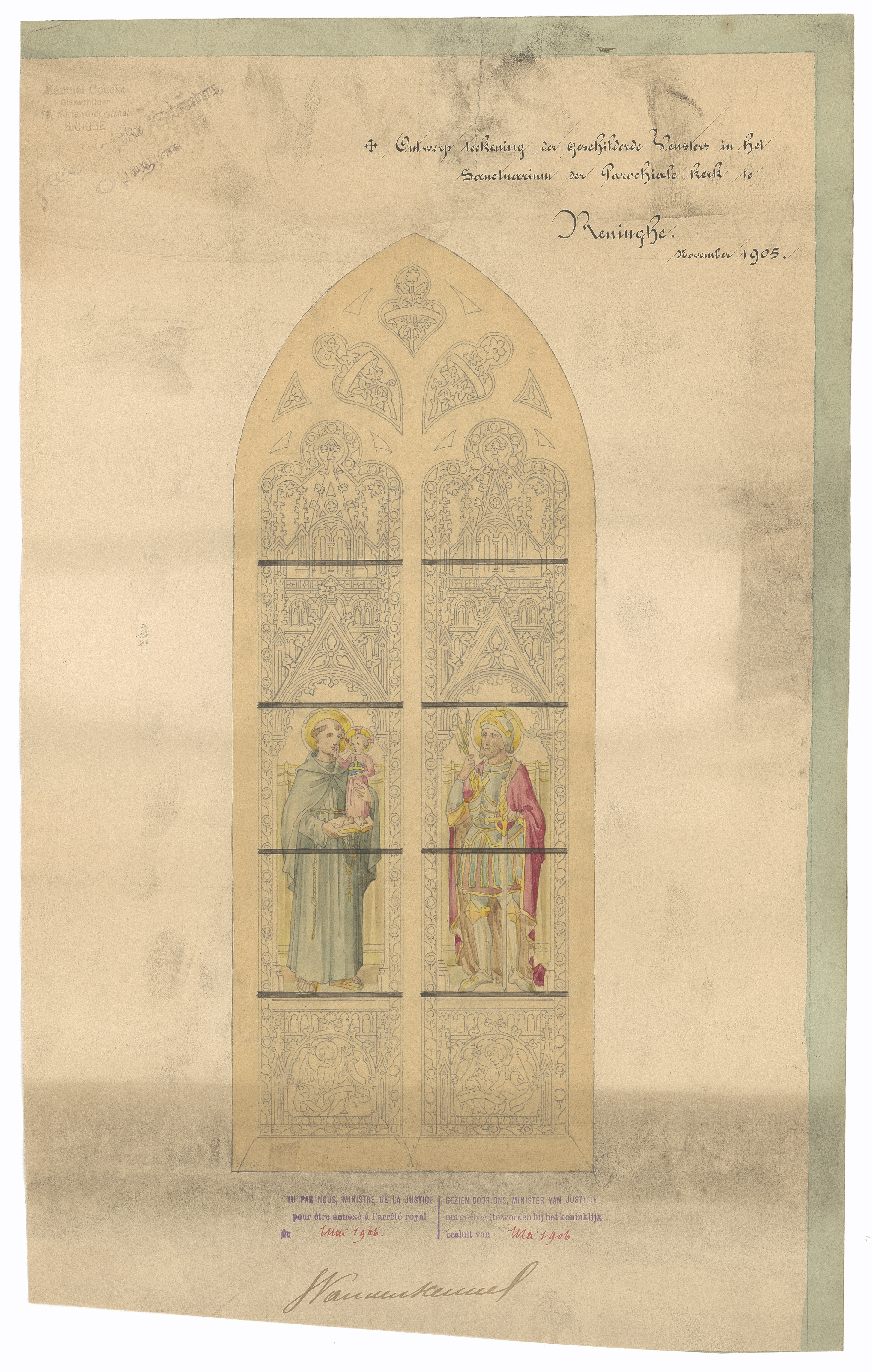 Opschrift: Ontwerp teekeing der geschilderde versters in het Sanctuarium der Parochiale kerk te Reninghe. Omschrijving plan: ontwerp glasraam (St. Antonius en St. Joris?) Datum KCML: deze informatie wordt niet vermeld op het archiefstuk Archiefnummer: W1151