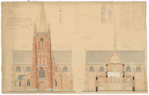 Opschrift: Province de Flandre Occidentale. Ville de Menin. Projet d'une nouvelle Eglise de la Paroisse de Saint-Joseph Omschrijving plan: opstand voorgevel en dwarsdoorsnede Datum KCML: 29/06/1901 Archiefnummer: W1162_02