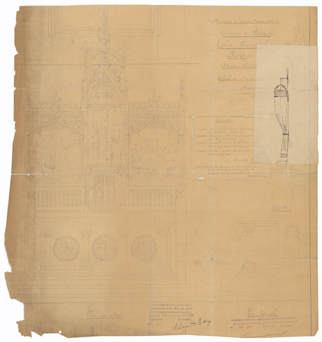 Opschrift: Province de Flandre Occidentale. Commune de Reninghe. Eglise Paroissiale. Projet du Maître-Autel Omschrijving plan: ontwerp hoogaltaar (aangepast ontwerp) Datum KCML: 4-11-1905 Archiefnummer: W1150_01