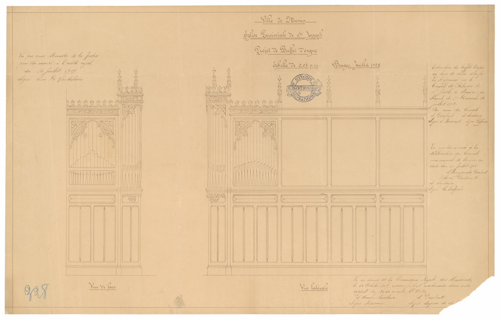 Opschrift: Ville de Menin. Eglise paroissiale de St. Joseph. Projet de Buffet d'orgue. Omschrijving plan: ontwerp orgelkast Datum KCML: 24/10/1908 Archiefnummer: W1176