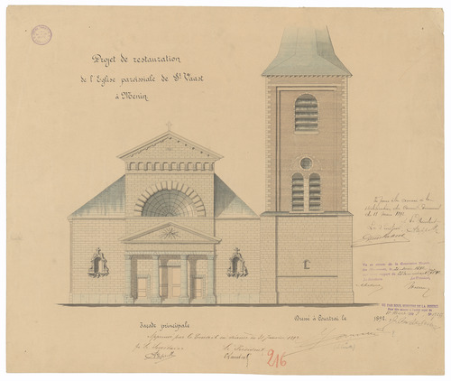 Opschrift: Projet de restauration de l'Eglise paroissiale de St. Vaast à Menin. Omschrijving plan: opstand voorgevel Datum KCML: 21/05/1892 Archiefnummer: W1158