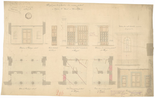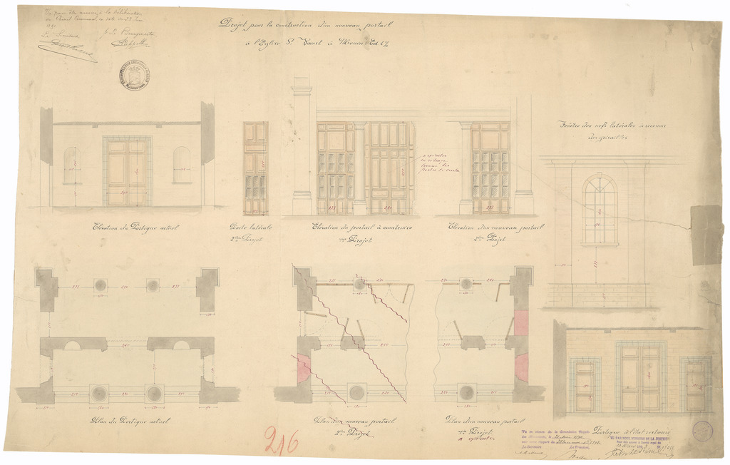 Opschrift: Projet pour la construction d'un nouveau portail à l'Eglise St. Vaast à Menin Omschrijving plan: diverse plannen portaal Datum KCML: 21/05/1892 Archiefnummer: W1159