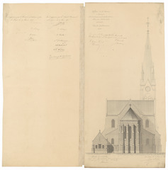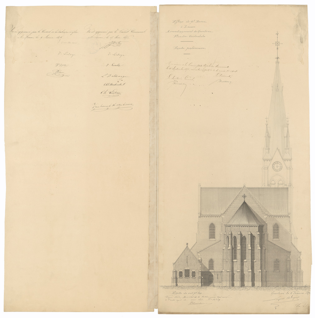 Opschrift: Eglise de St. Bavon à Lauwe. Arrondissement de Courtrai. Flandre Occidentale Omschrijving plan: opstanden achter- en zijgevel (deel 1) Datum KCML: 16/09/1876 Archiefnummer: W1181_back
