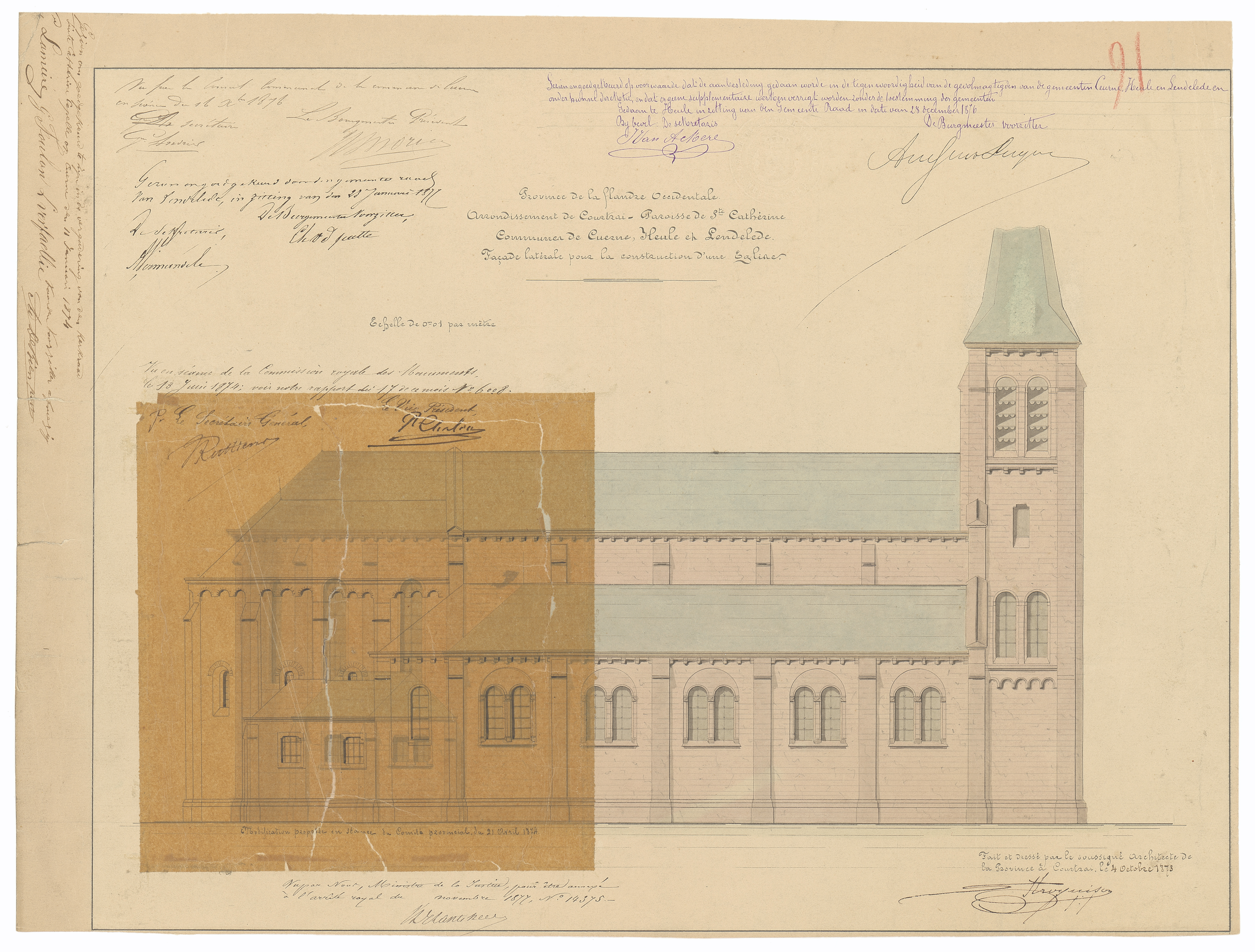 Opschrift: Province de la flandre occidentale. Arrondissement de Courtrai. Paroisse de Ste. Cathérine. Commune de Cuerne - Heule et Lendelede. Façade latérale pour la construction d'une Eglise. Omschrijving plan: opstand zijgevel 1 Datum KCML: 13/06/1874 Archiefnummer: W1100