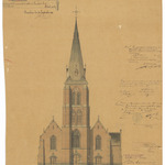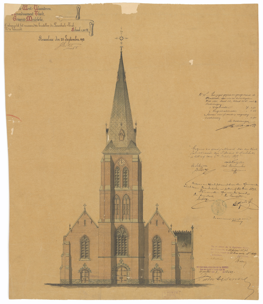 Opschrift: Provincie West-Vlaanderen. Arrondissement Thielt. Gemeente Meulebeke. Ontwerp tot het vermeerderen en herstellen der Parochiale Kerk. Omschrijving plan: opstand voorgevel Datum KCML: 11/02/1893 Archiefnummer: W1204