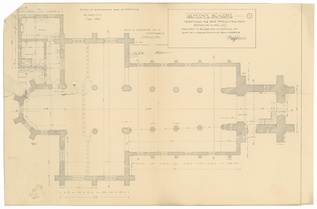 Opschrift: Gemeente Schoore. Heropbouwing der parochiale kerk. Omschrijving plan: plattegrond niveau 0 Datum KCML: deze informatie wordt niet vermeld op het archiefstuk Archiefnummer: W1212