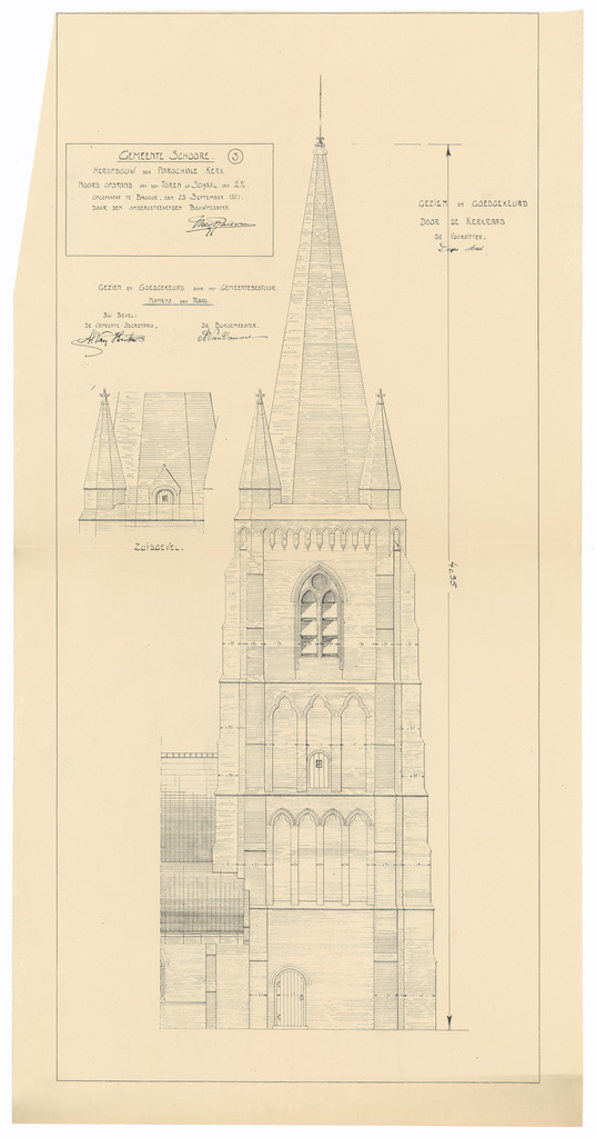 Opschrift: Gemeente Schoore. Heropbouw der parochiale kerk. Omschrijving plan: opstand toren Datum KCML: deze informatie wordt niet vermeld op het archiefstuk Archiefnummer: W1215