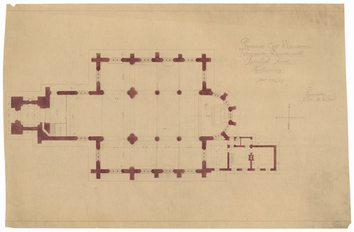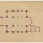 Opschrift: Provincie Oost-Vlaanderen. Gemeente Ramskcappelle. Parochiale Kerk. Herbouwing Omschrijving plan: plattegrond niveau 0 Datum KCML: deze informatie wordt niet vermeld op het archiefstuk Archiefnummer: W1283