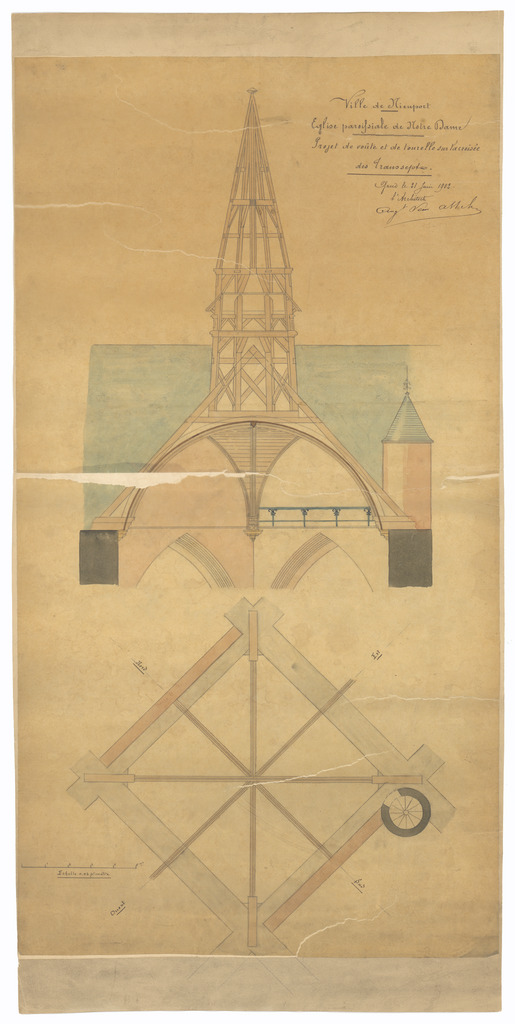 Opschrift: Ville de Nieuport. Eglise paroissiale de Notre Dame. Projet de voûte et de tourelle sur la croisée des transepts Omschrijving plan: plannen toren Datum KCML: deze informatie wordt niet vermeld op het archiefstuk Archiefnummer: W1264