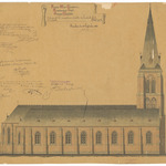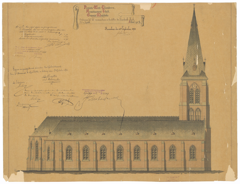 Opschrift: Provincie West-Vlaanderen. Arrondissement Thielt. Gemeente Meulebeke. Ontwerp tot het vermeerderen en herstellen der Parochiale Kerk. Omschrijving plan: opstand zijgevel 1 Datum KCML: 11/02/1893 Archiefnummer: W1205