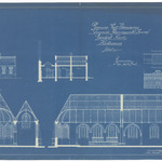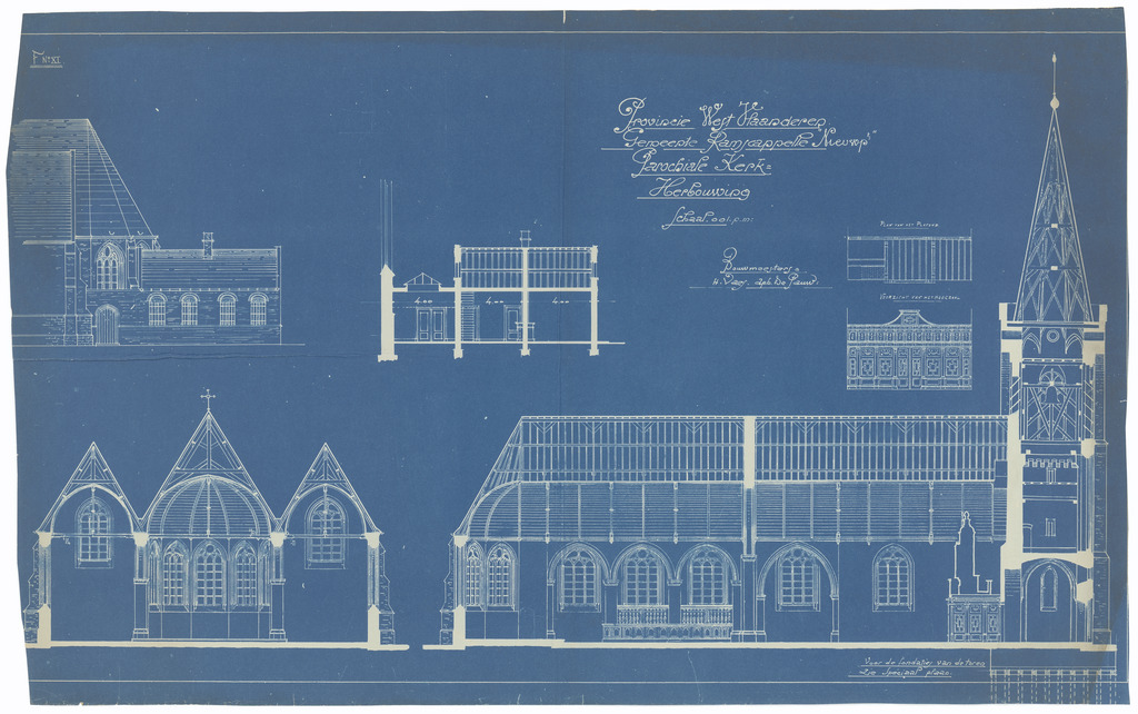 Opschrift: Provincie Oost-Vlaanderen. Gemeente Ramskcappelle. Parochiale Kerk. Herbouwing Omschrijving plan: langs- en dwarsdoorsnede Datum KCML: deze informatie wordt niet vermeld op het archiefstuk Archiefnummer: W1290