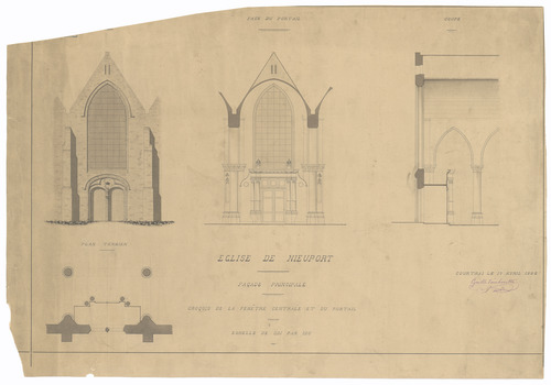 Opschrift: Eglise de Nieuport. Façade principale. Croquis de la fenêtre centrale et du portail Omschrijving plan: plattegrond, opstand gevel en doorsneden Datum KCML: deze informatie wordt niet vermeld op het archiefstuk Archiefnummer: W1263