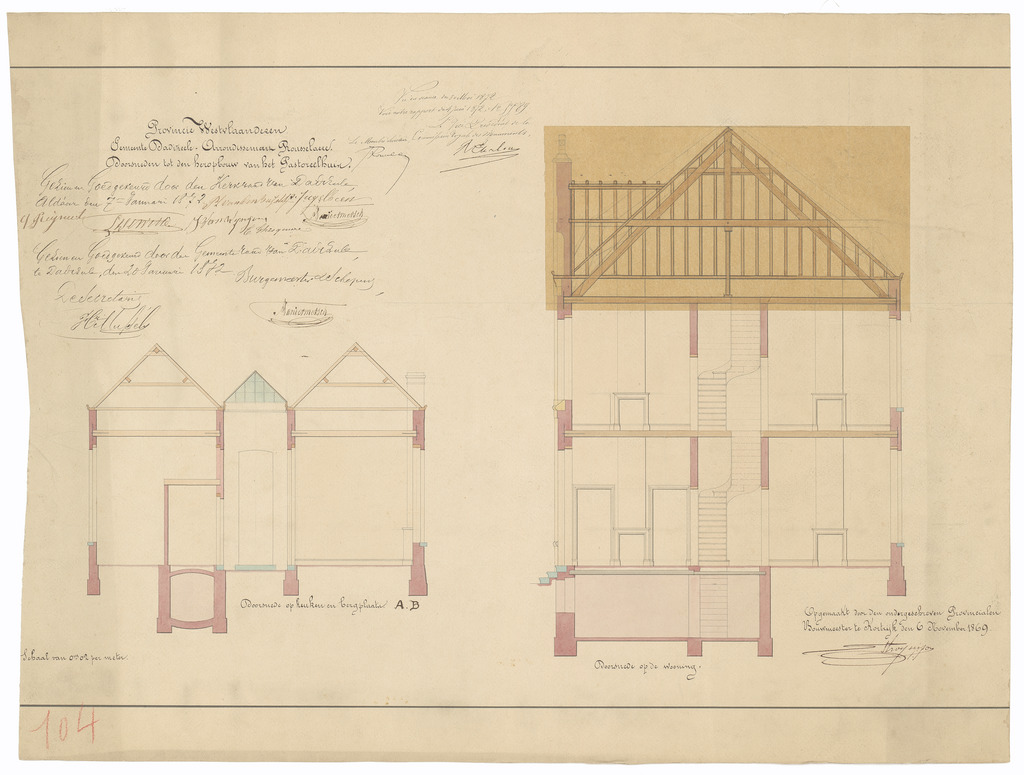 Opschrift: Provincie Westvlaanderen. Gemeente Dadizeele. Arrondissement Rousselaere. Plan tot den heropbouw van het Pastoreelhuis. Omschrijving plan: dwarsdoorsnede Datum KCML: 30/05/1872 Archiefnummer: W1262