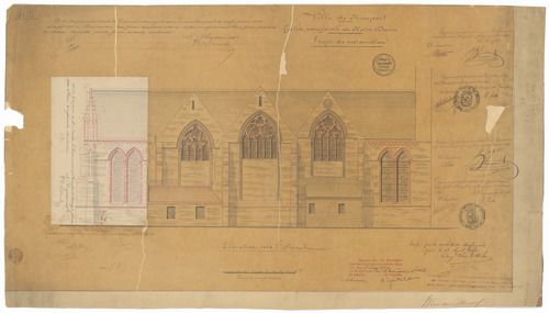 Opschrift: Ville de Nieuport. Eglise paroissiale de N.Dame. Projet de restauration Omschrijving plan: opstand achtergevel (aangepast ontwerp) Datum KCML: 08/07/1899 Archiefnummer: W1269_01