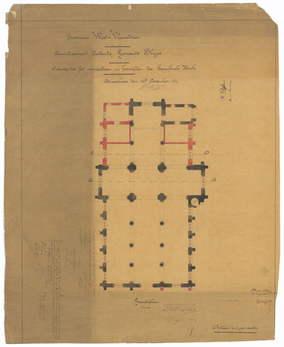 Opschrift: Provincie West-Vlaanderen. Arrondissement Oostende. Gemeente Slype. Ontwerp tot het vermeerderen en herstellen der parochiale kerk. Omschrijving plan: plattegrond niveau 0 Datum KCML: 17/04/1897 Archiefnummer: W1231