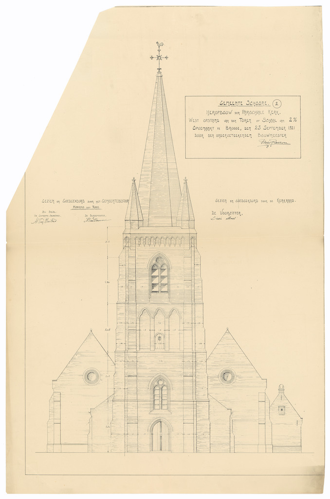 Opschrift: Gemeente Schoore. Heropbouw der parochiale kerk. Omschrijving plan: opstand voorgevel Datum KCML: deze informatie wordt niet vermeld op het archiefstuk Archiefnummer: W1213