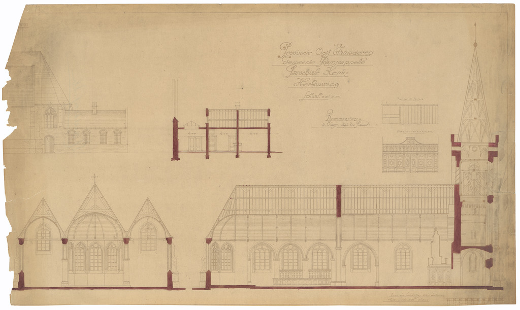 Opschrift: Provincie Oost-Vlaanderen. Gemeente Ramskcappelle. Parochiale Kerk. Herbouwing Omschrijving plan: langs- en dwarsdoorsnede Datum KCML: deze informatie wordt niet vermeld op het archiefstuk Archiefnummer: W1286