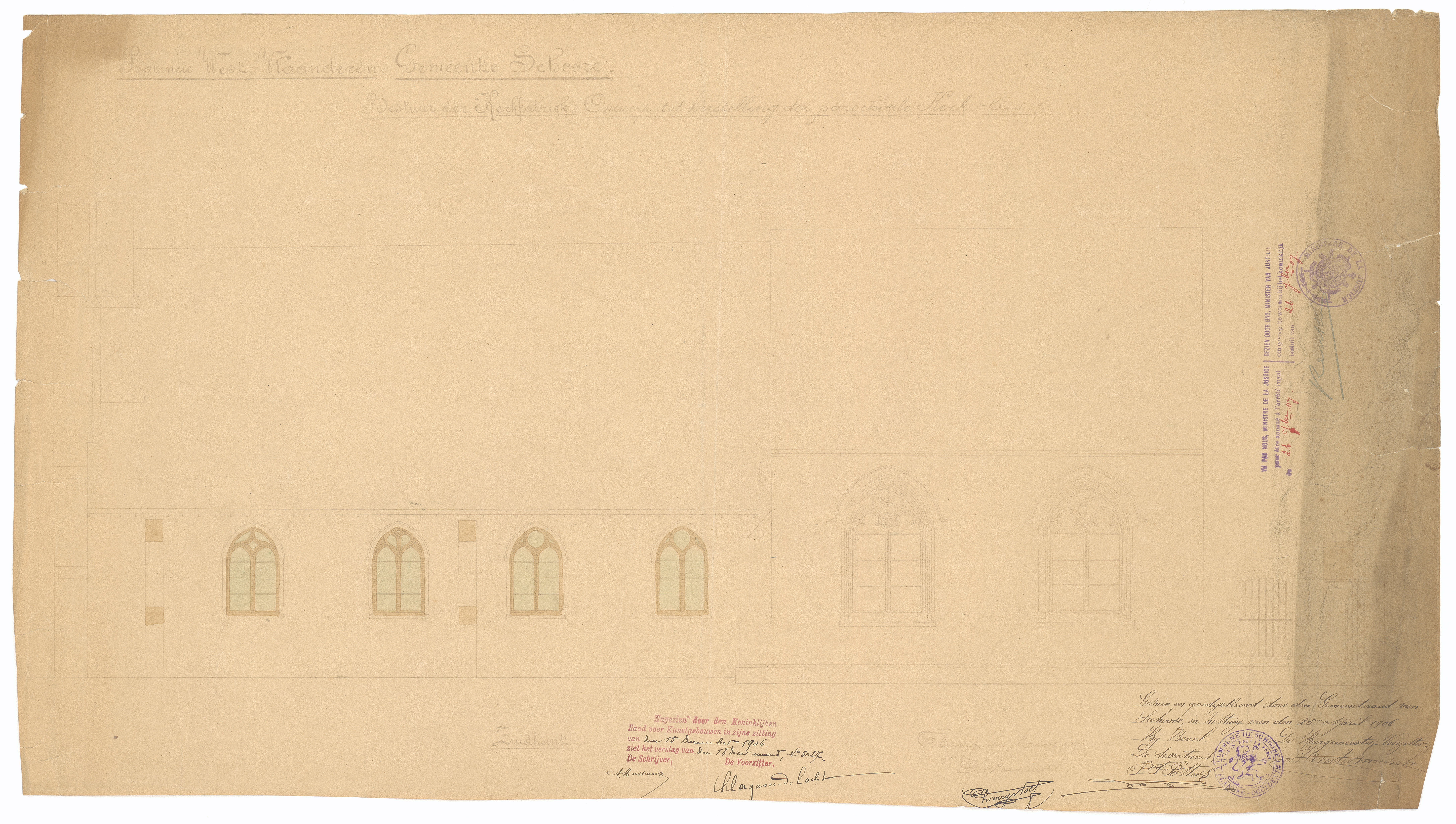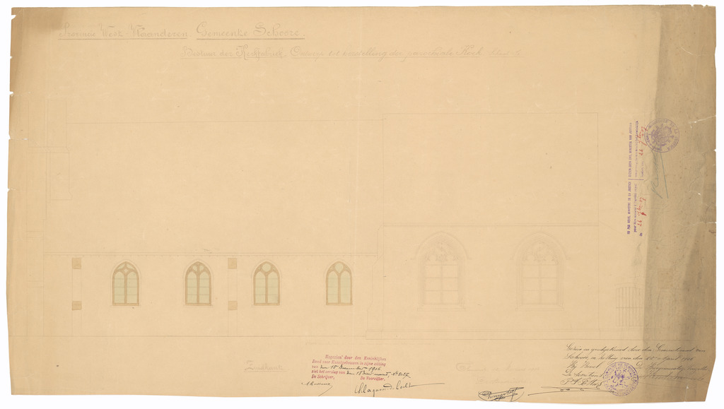 Opschrift: Provincie West-Vlaanderen. Gemeente Schoore. Berstuur der Kerkfabriek. Ontwerp tot herstelling der Parochiale Kerk. Omschrijving plan: opstand Z-gevel Datum KCML: 15/12/1906 Archiefnummer: W1210