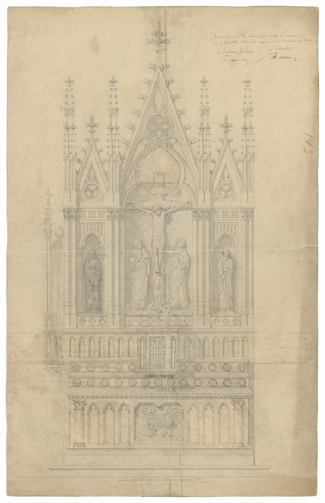 Opschrift: deze informatie wordt niet vermeld op het archiefstuk Omschrijving plan: ontwerp hoogaltaar Datum KCML: 08/06/1877 Archiefnummer: W1235