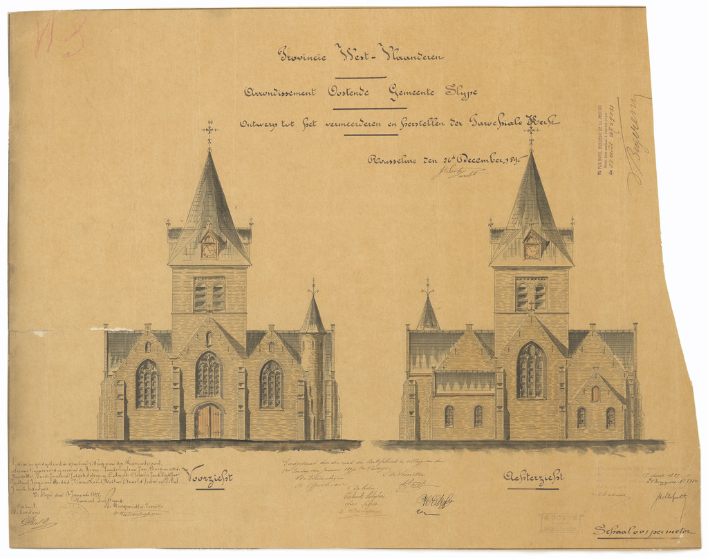 Opschrift: Provincie West-Vlaanderen. Arrondissement Oostende. Gemeente Slype. Ontwerp tot het vermeerderen en herstellen der parochiale kerk. Omschrijving plan: opstanden voor- en achtergevel Datum KCML: 17/04/1897 Archiefnummer: W1232