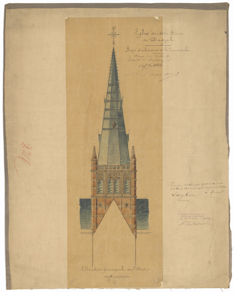 Opschrift: Eglise de N. Dame à Dadizeele. Projet d'Achèvement de la tour centrale. Omschrijving plan: opstand voorgevel Datum KCML: 13/12/1890 Archiefnummer: W1250